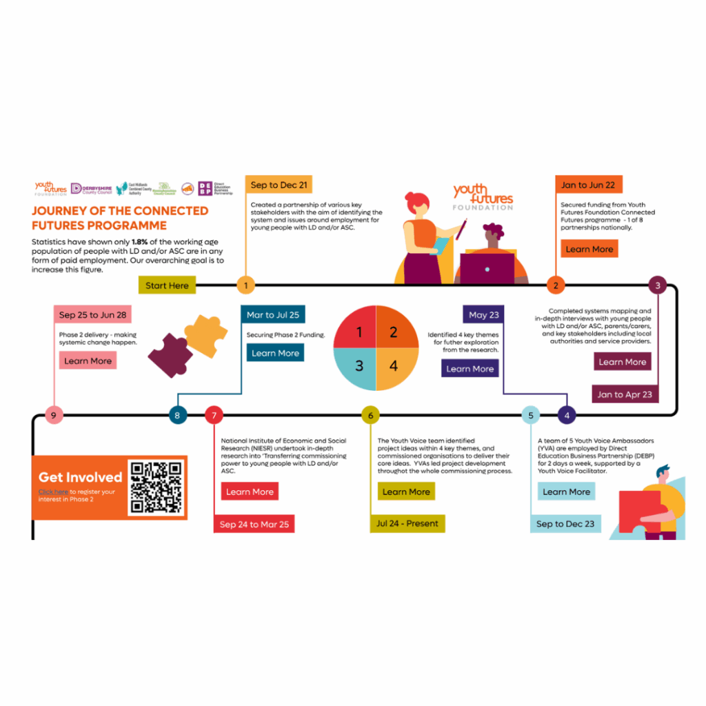 Connected Futures is an East Midlands County Combined Authority programme funded by the Youth Futures Foundation. We’re working with all four local authorities (Derby City Council, Derbyshire County Council, Nottingham City Council and Nottinghamshire County Council) along with the Direct Education Business Partnership (DEBP), to remove barriers and create better job opportunities for young people with learning disabilities and/or autism.